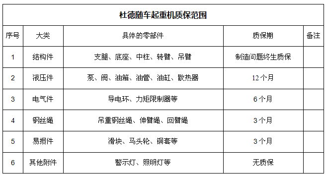 用戶在按照使用維護(hù)說明書要求正確使用、運(yùn)輸、貯存、安裝、保養(yǎng)維護(hù)和使用的情況下,自本公司發(fā)貨之日起12個(gè)月內(nèi),因產(chǎn)品材質(zhì)、制造加工、裝配質(zhì)量等制造質(zhì)量問題而產(chǎn)生的損壞,由本公司免費(fèi)維修和更換零部件;結(jié)構(gòu)件(底座、中柱、轉(zhuǎn)臂、吊臂、支腿)終生質(zhì)保,但因用戶不按使用說明操作不當(dāng)或超載問題,造成損壞變形不予三包。